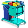 Διαθέτει 2 κάδους σφουγγαρίσματος 15lt, 1 πρέσα σφουγγαρίσματος, 4 βοηθητικούς κάδους 6lt, 2 καλάθια βάσης 12lt, 1 πλαστικό ντουλάπι, συνθετική σακούλα 120lt, καπάκι για τον κάδο των απορριμμάτων